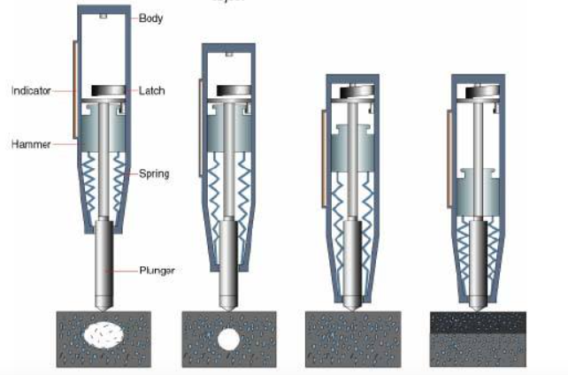 Karena timbul tumbukan antara massa tersebut dengan permukaan beton, massa tersebut akan dipantulkan kembali. Jarak pantulan massa yang terukur memberikan indikasi kekerasan permukaan beton. Kekerasan beton dapat memberikan indikasi kuat tekannya.